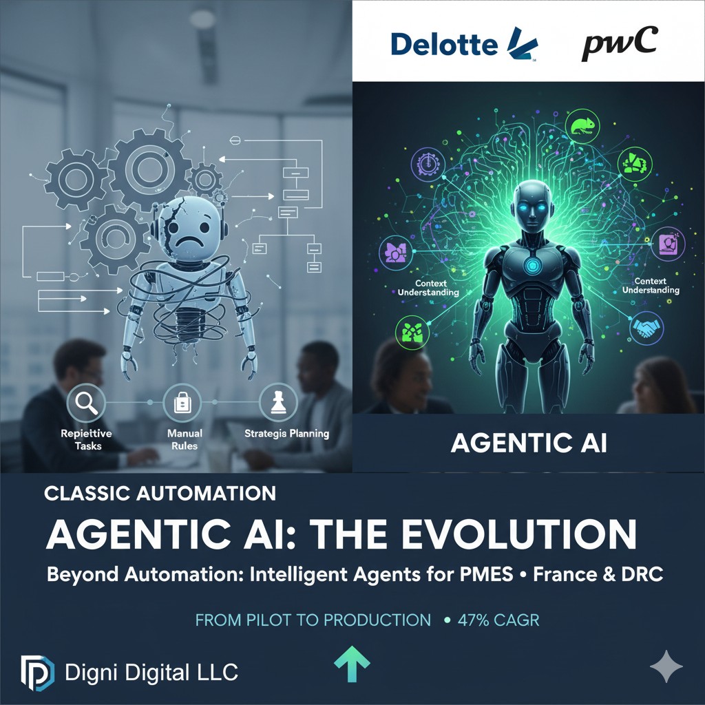 Agentic AI is not the same as classic rule-based automation. Deloitte and PwC frame 2026 as the year when agents IA move from pilot to production: 47% CAGR for agentic systems to 2030, and a clear shift from "automation" to "intelligent agents" that understand context and handle variability. For PME in France and the DRC, this distinction matters: it determines when to replace or complement traditional tools with AI employees.